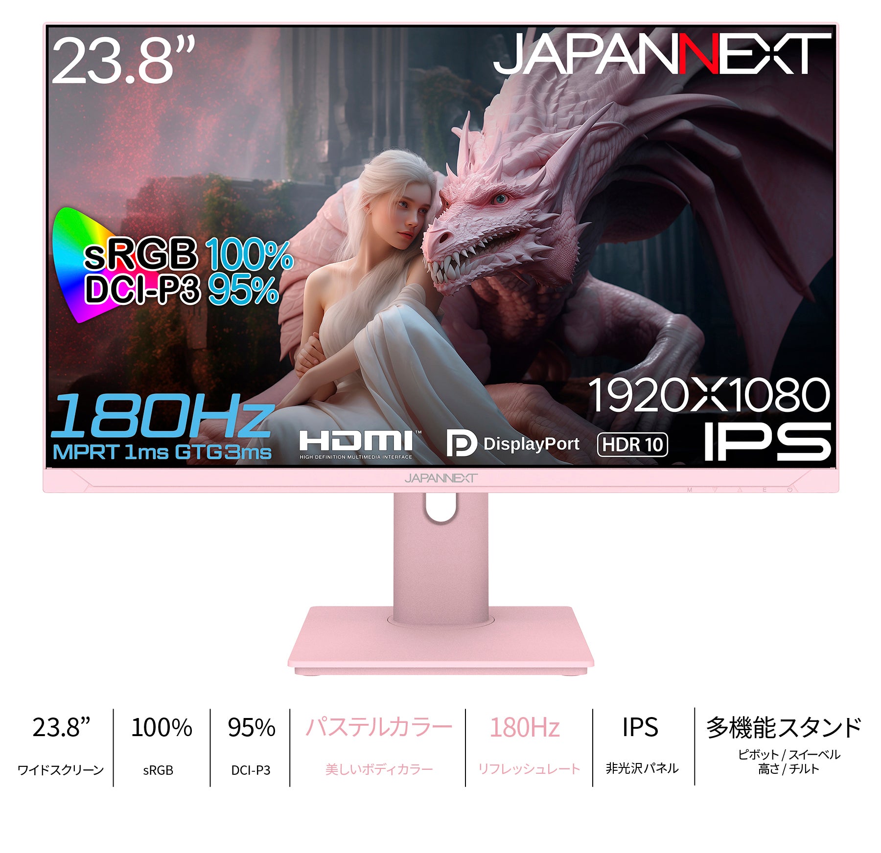 23.8インチのIPSパネルを搭載、180Hzの高速リフレッシュレートに対応し、本体にパステルピンクカラーを採用したフルHD(1920 x 1080)解像度のゲーミングモニターです。パステルピンクカラーを本体に採用。美しい視覚効果と個性的なデザインを融合。華やかな色調でゲームプレイを彩り、デスクトップにスタイリッシュなアクセントを提供します。