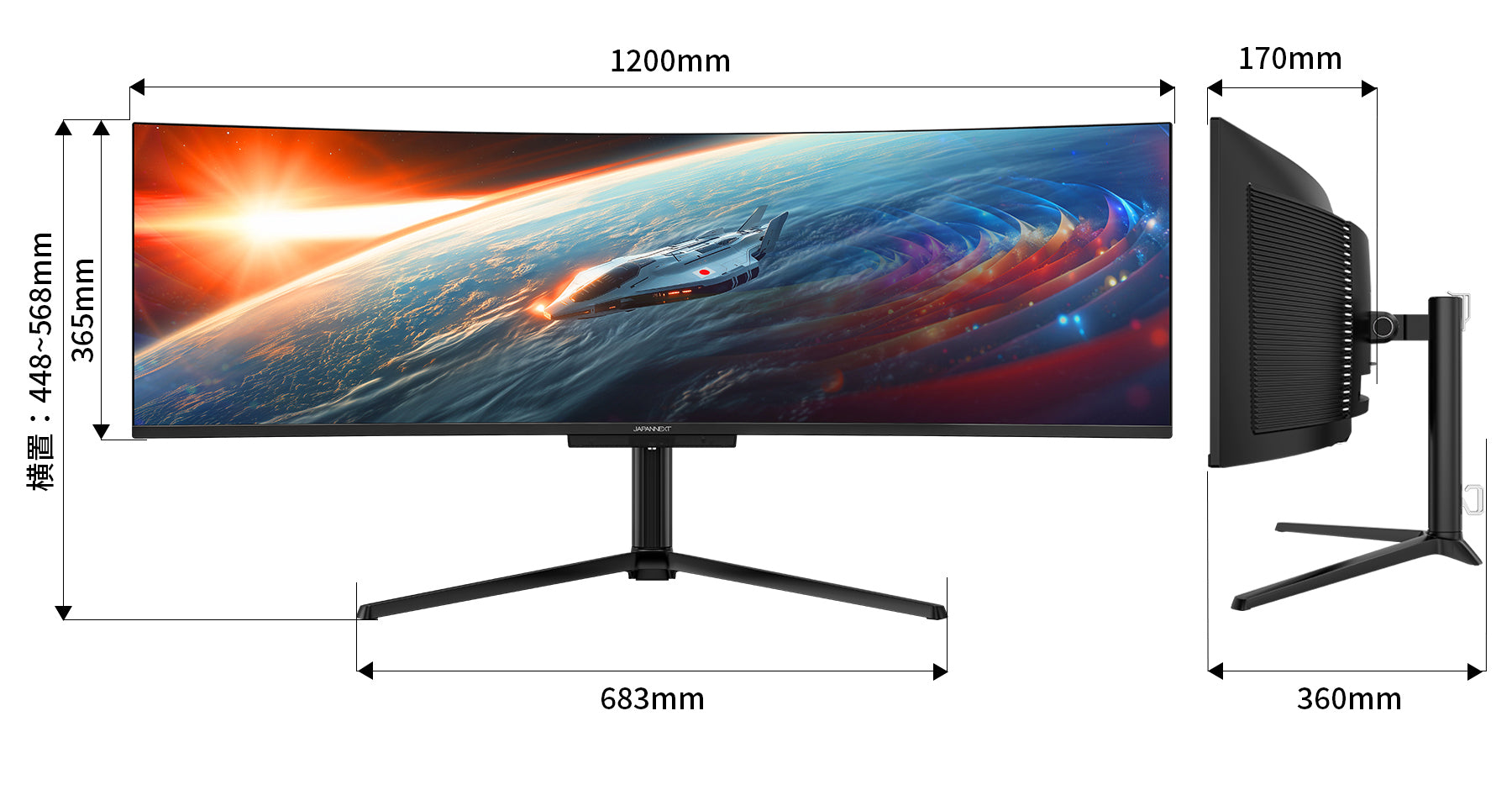 49インチ、 アスペクト比、32:9 。モニター幅は圧巻の120cm。