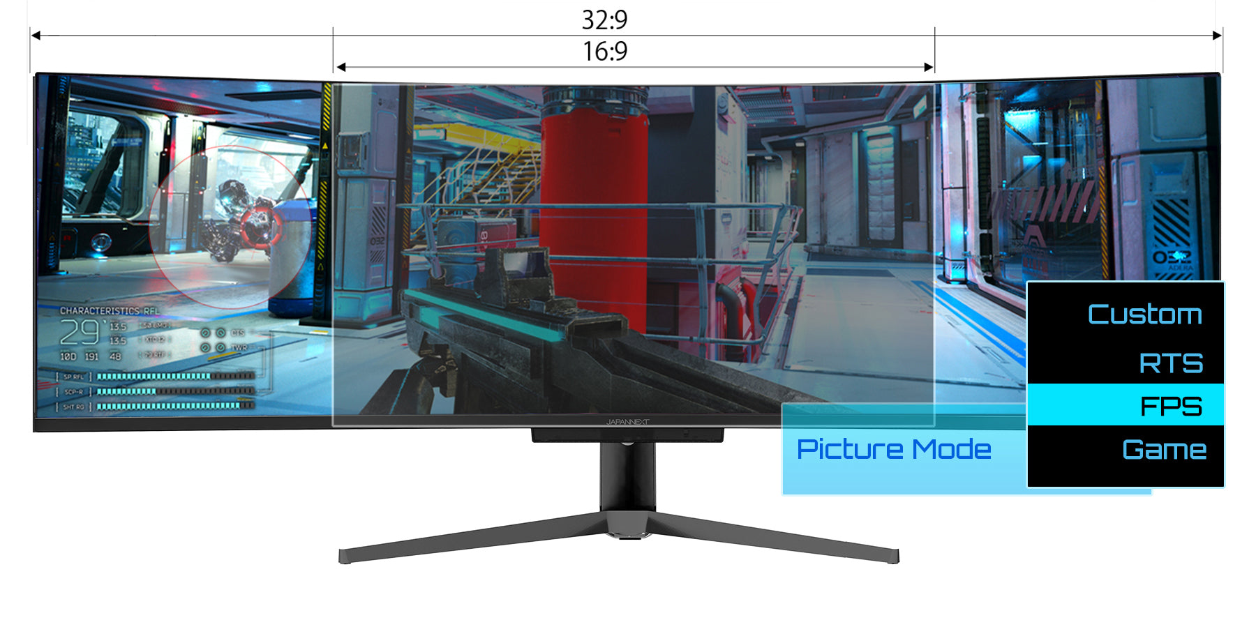 32:9のアスペクト比により、広い表示領域を活用でき、FPSや情報量が重要なMMOなどのゲームプレイに最適です。大画面49インチ(R1800)の湾曲パネルはプレイヤーを包み込むように映像を表現し、より高いゲームへの没入感を実現します。