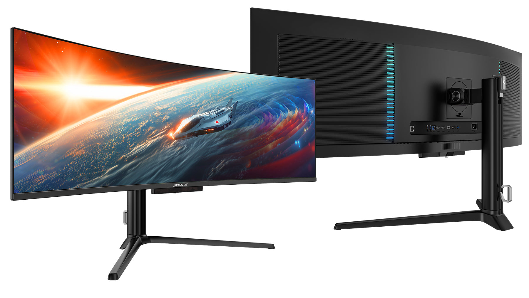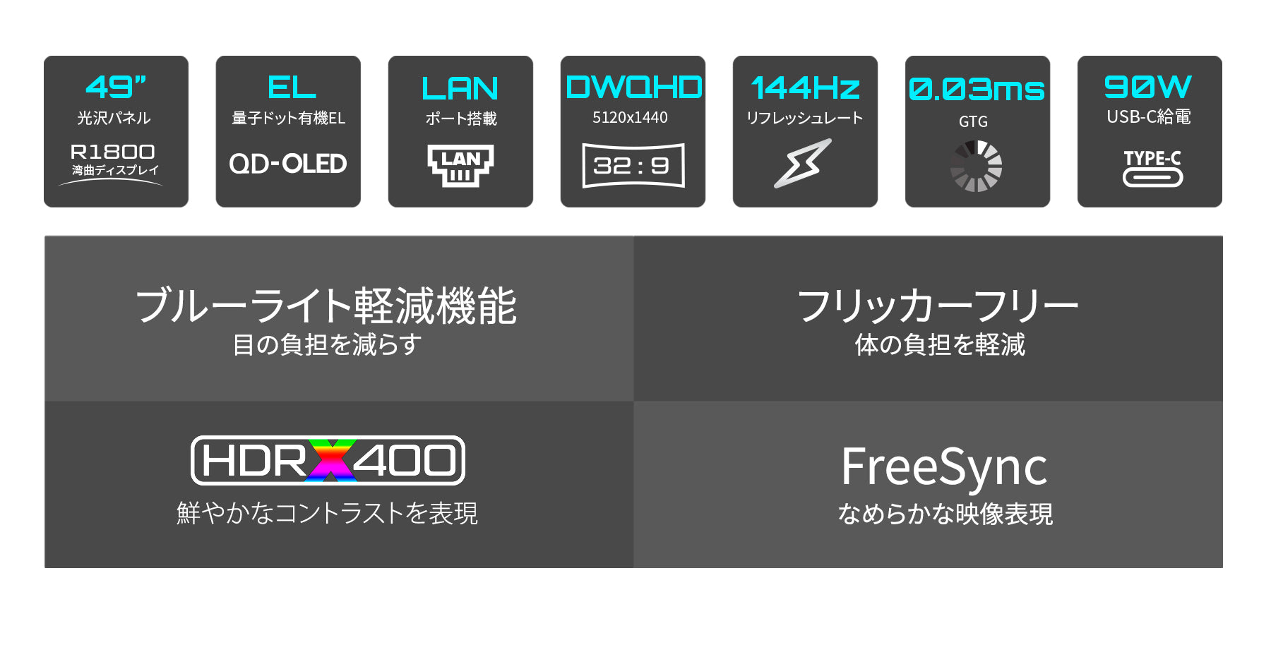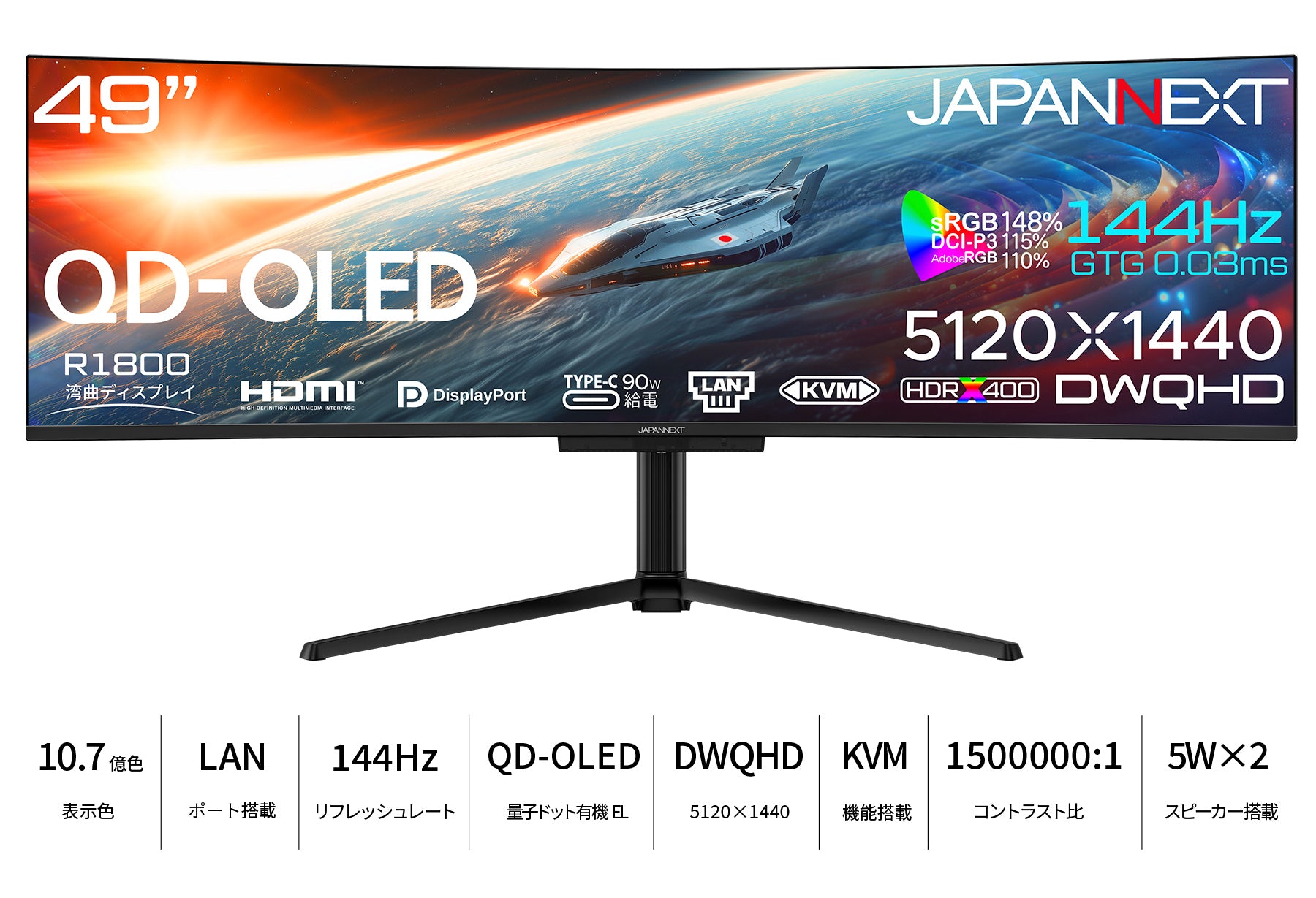 本製品は、大画面49インチの量子ドット有機ELパネル(QD-OLED)を搭載し、144Hzの高速リフレッシュレートと0.03ms(GTG)の高速応答速度に対応した、Dual WQHD(5120x1440)解像度の湾曲ウルトラワイドゲーミングモニターです。