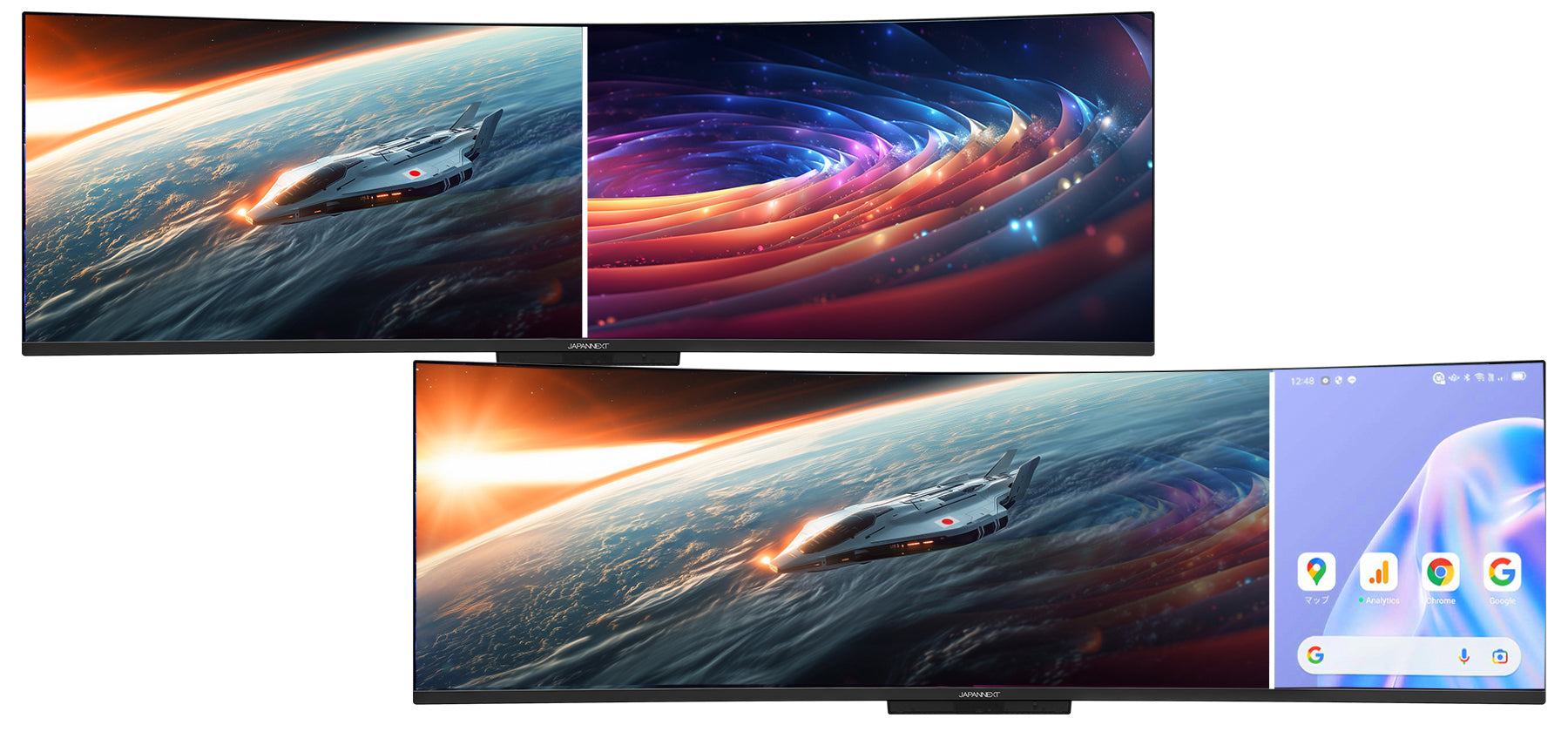 2つの入力映像を同時に表示する「PBP」(Picture by Picture)。USB-C接続でスマホも表示可能です。(2Win 2:1,1:2)
