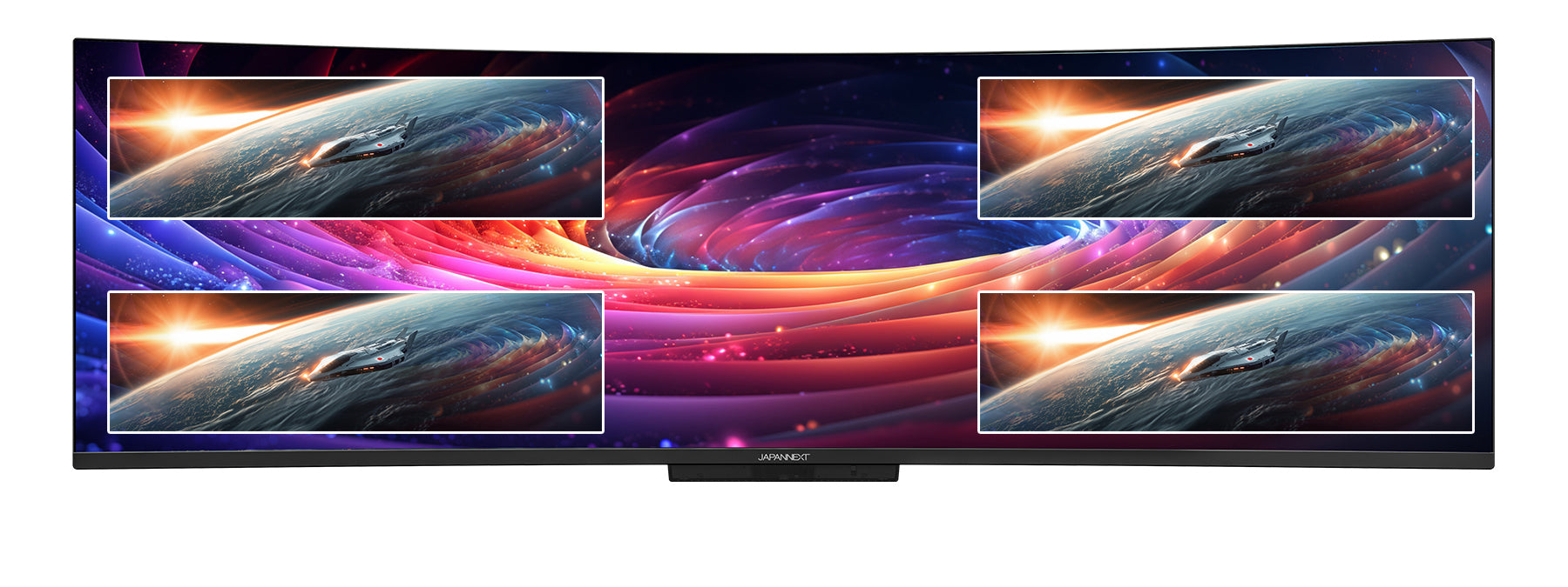 Dual WQHD(5120x1440)解像度は、フルHD(1920x1080)解像度の約3.5倍の高解像度を実現します。より精細でクリアな画像の表示を可能にし、広い視野での視覚体験を提供します。水平解像度はフルHDの約2.6倍、WQHDの横幅を2つ分並べたような画面スペースを提供します。