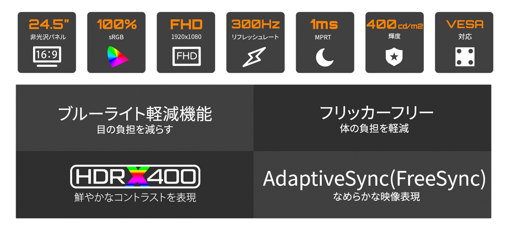 24.5インチのTNパネルを搭載し、300Hzの高速リフレッシュレートに対応したフルHD(1920x1080)解像度のゲーミングモニターです。