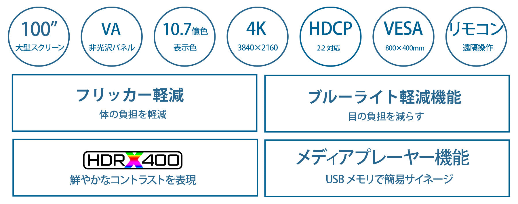 100インチの大画面で4K(3840x2160)解像度に対応。4KはフルHD(1920×1080)解像度の約4倍の作業領域を実現する3840×2160ドットの解像度となり、高精細な表示を実現できます。大画面液晶は大きな会議室での使用はもちろん、サイネージ用途や、映画などの鑑賞等様々な用途にお使いいただけます。