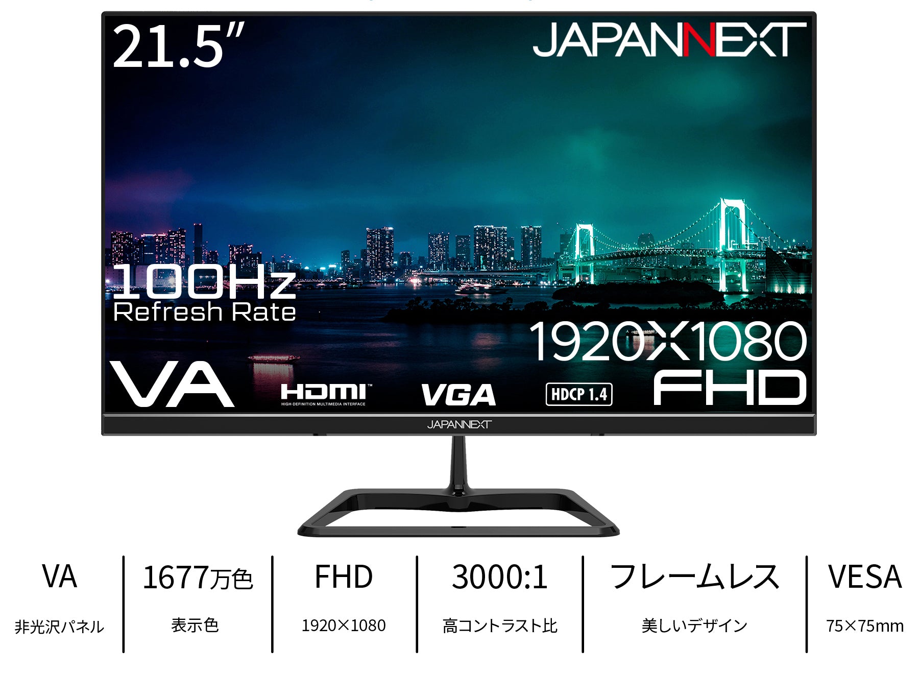 21.5インチのVAパネルを搭載、使いやすいフルHD(1920x1080)解像度に対応した液晶モニターです。