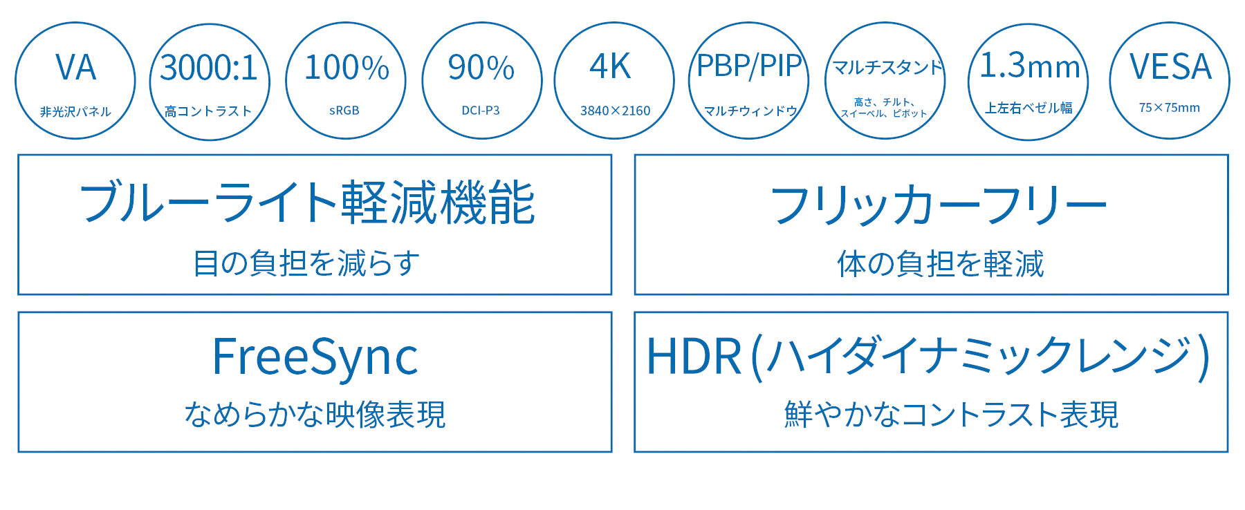 4KはフルHD(1920×1080)解像度の約4倍の作業領域を実現する3840×2160ドットの解像度となり、高精細な表示を実現できます。高画質VAパネルを採用、3000:1の高コントラスト比は、より黒をくっきりと表現をすることが可能、写真や動画を色鮮やかに映し出します。