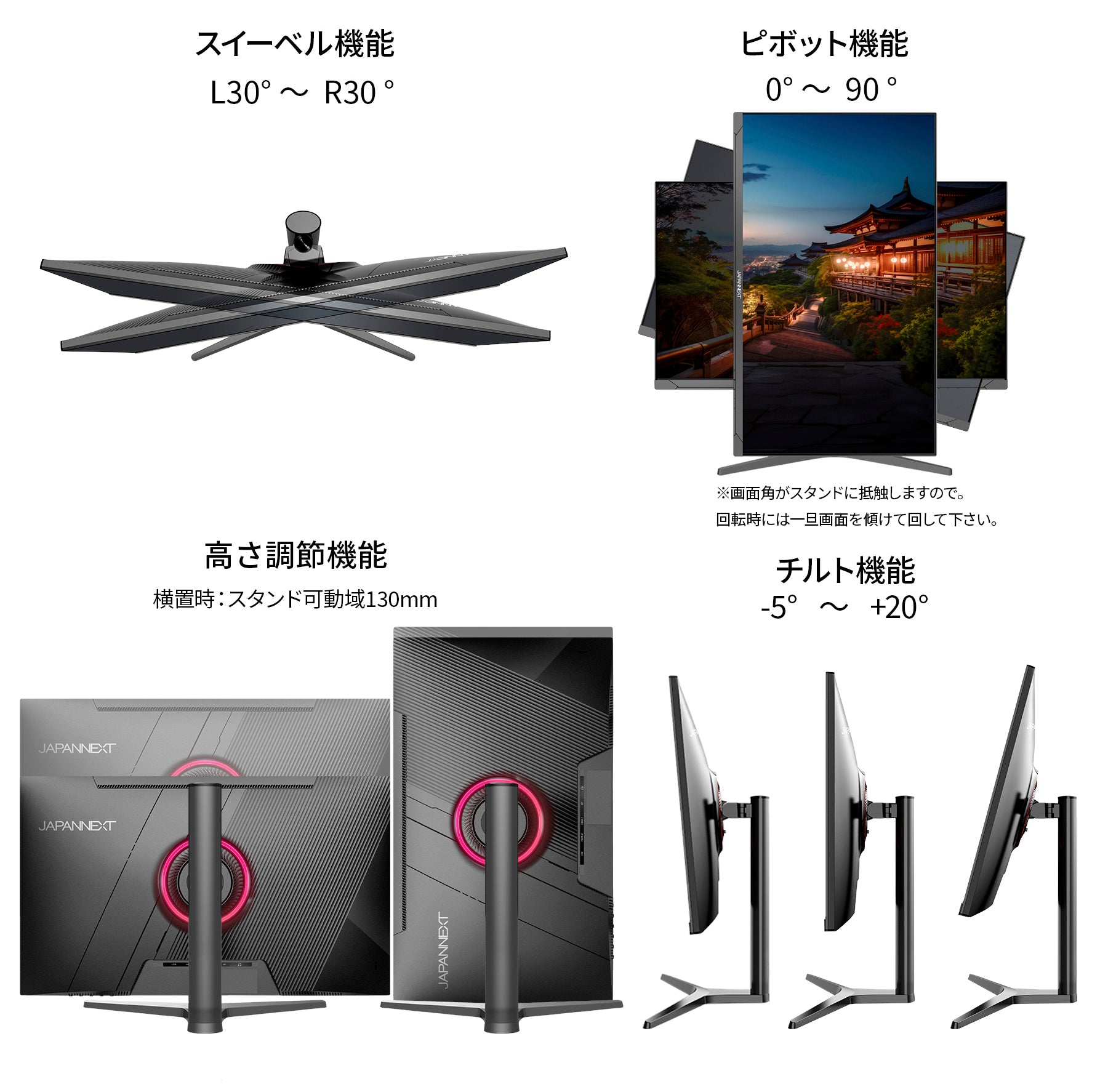 最大130mm(横置時)の範囲で高さ調整を行うことが可能な便利な昇降式スタンドを搭載。また、90度右に回転させての縦での使用も可能です。