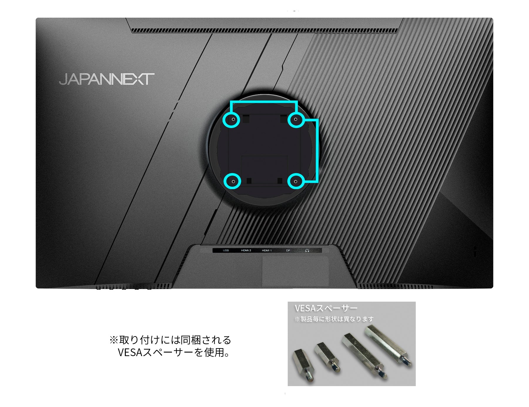 75x75のVESAマウントに対応(同梱のVESAスペーサーを使用)しているので別売のモニターアームやモニタースタンドなどへの取り付けが可能です。