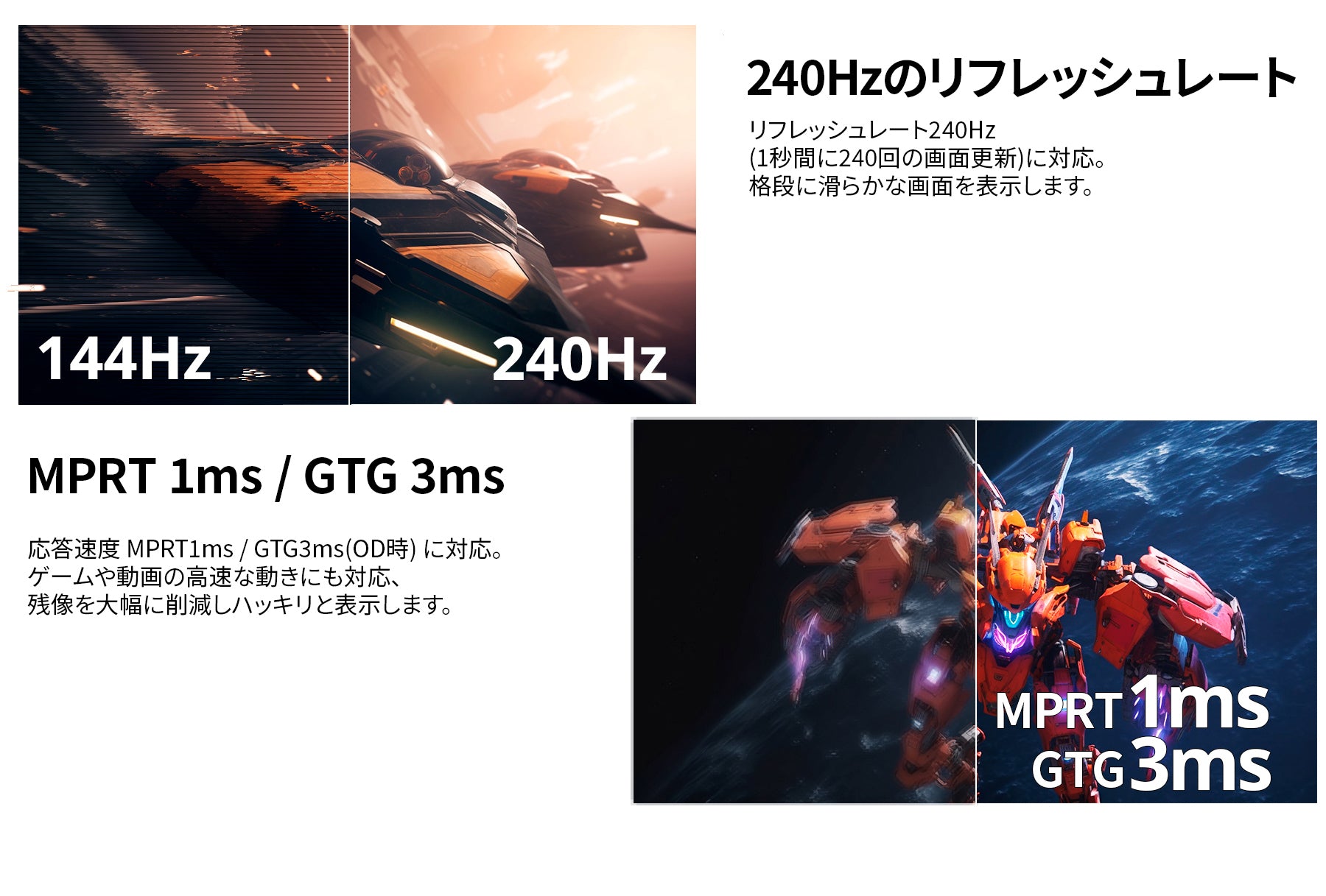 高速リフレッシュレート/240Hz、応答速度/MPRT:1ms GTG:3ms対応