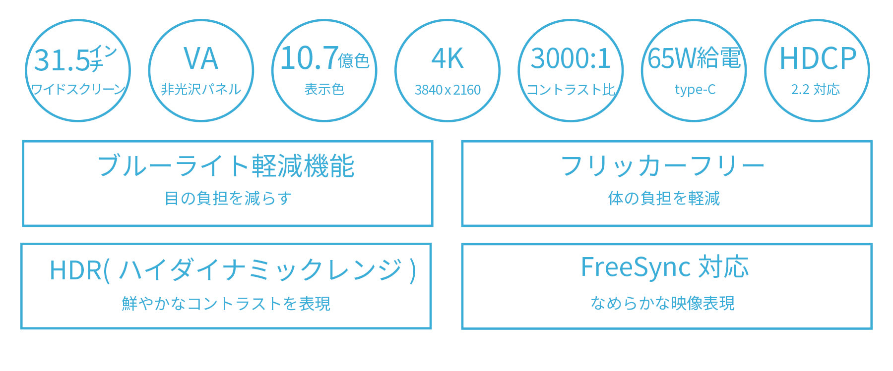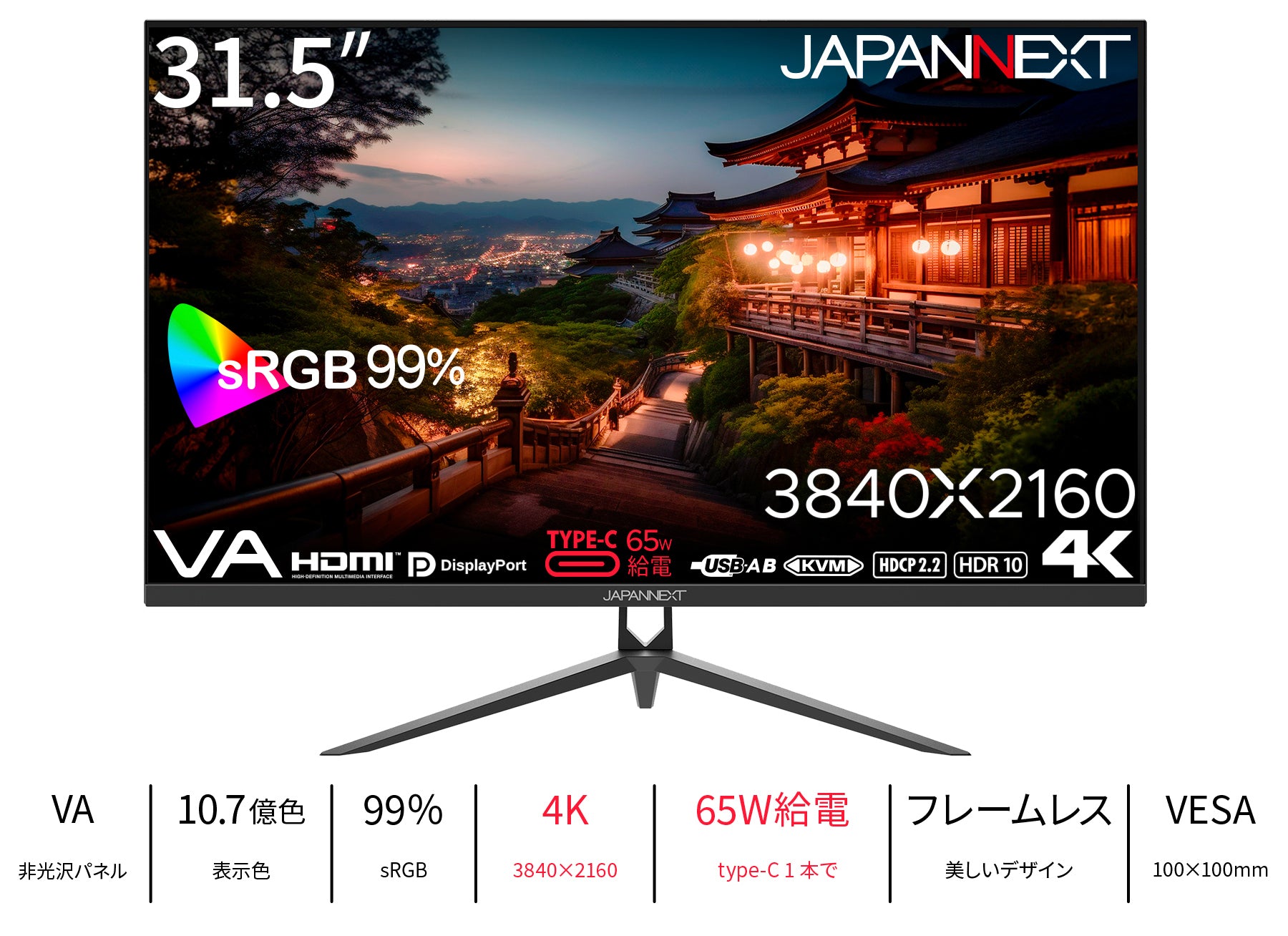 31.5インチのVAパネルを採用した4K(3840x2160)解像度の液晶モニターです。4KはフルHD(1920×1080)解像度の約4倍の作業領域を実現する3840×2160ドットの解像度となり、高精細な表示を実現できます。