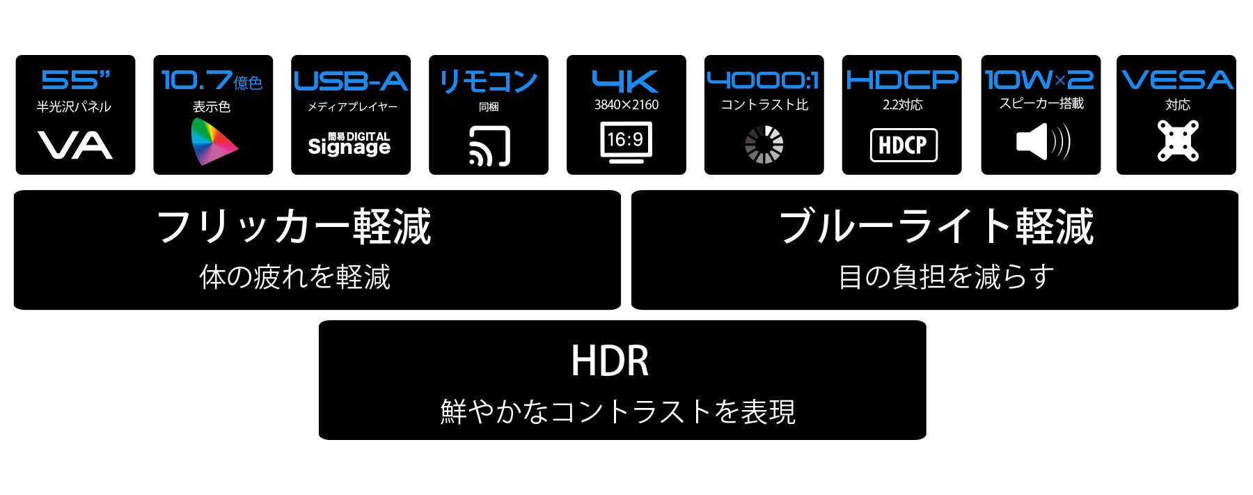 インターフェイスは、 HDMI 2.0×3を搭載。パソコンのみならず、ブルーレイディスクプレーヤー、家庭用ゲーム機、デジタルビデオカメラなどを1本のケーブルで接続できます。さらに、 USB ポートを搭載していますので、デジタルサイネージとしてもご利用できます(屋内使用のみ)。また、ビデオ/音声入力端子×1、コンポーネント入力端子×1および、オプティカル音声出力端子×1を搭載し、様々な機器との接続が可能です。