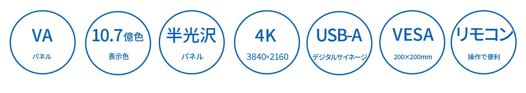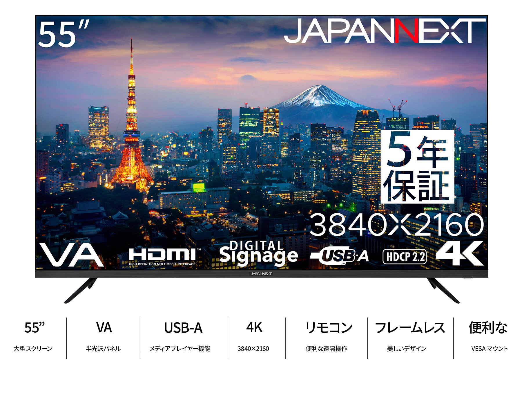 55インチ VAパネル搭載 USBからの再生に対応した4K(3840x2160)解像度の大型液晶モニターとなります。4KはフルHD(1920×1080)解像度の約4倍の作業領域を実現する3840×2160ドットの解像度となり、高精細な表示を実現できます。大画面液晶は大きな会議室での使用はもちろん、サイネージ用途や、映画などの鑑賞等様々な用途にお使いいただけます。