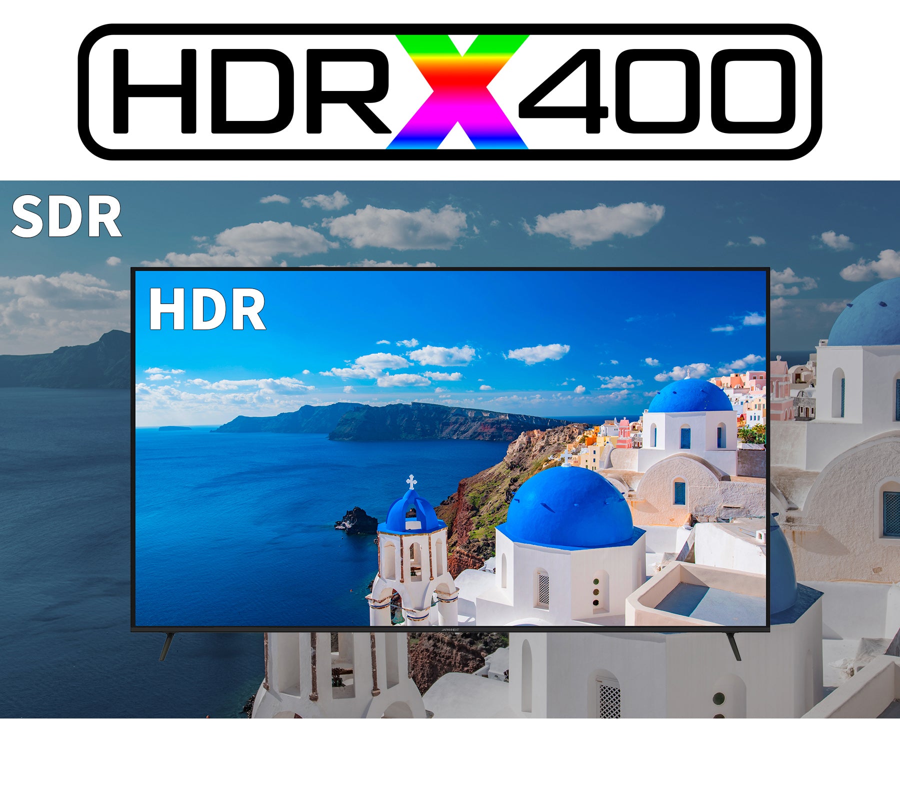 最大輝度400cd/m2、sRGB:99%の広色域に対応した液晶パネルはHDR400相当の性能を持ち、コンテンツを色鮮やかに映し出します。HDR(ハイダイナミックレンジ)は、明るい部分も暗い部分もくっきり表現しリアルに迫った深みのある映像を演出します。HDR対応のブルーレイディスクやビデオ・オン・デマンド、ゲームなどの表示が可能です。