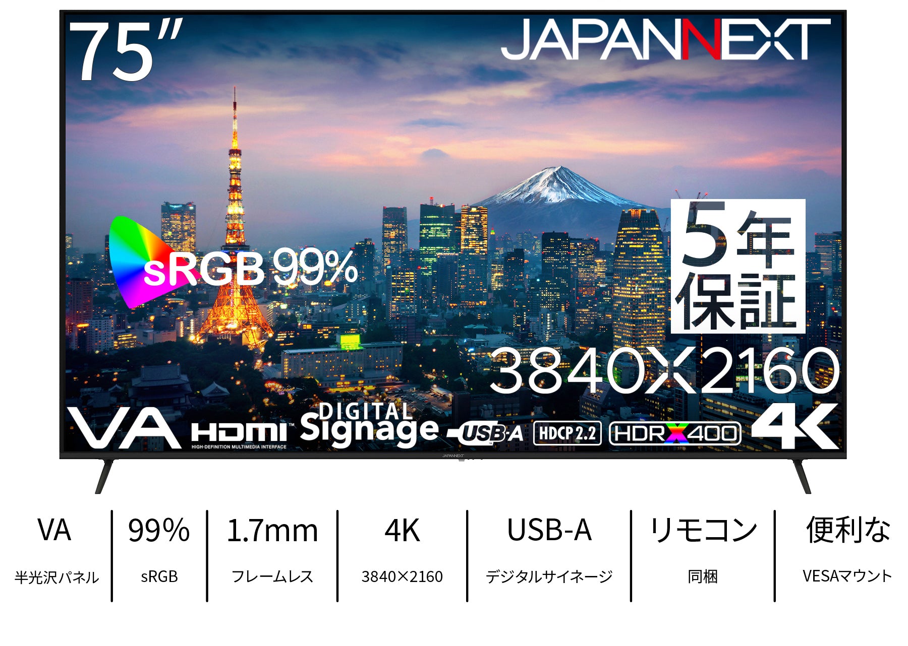 75インチの大画面でVAパネルを搭載し、4K(3840x2160)解像度に対応した大型液晶モニターとなります。