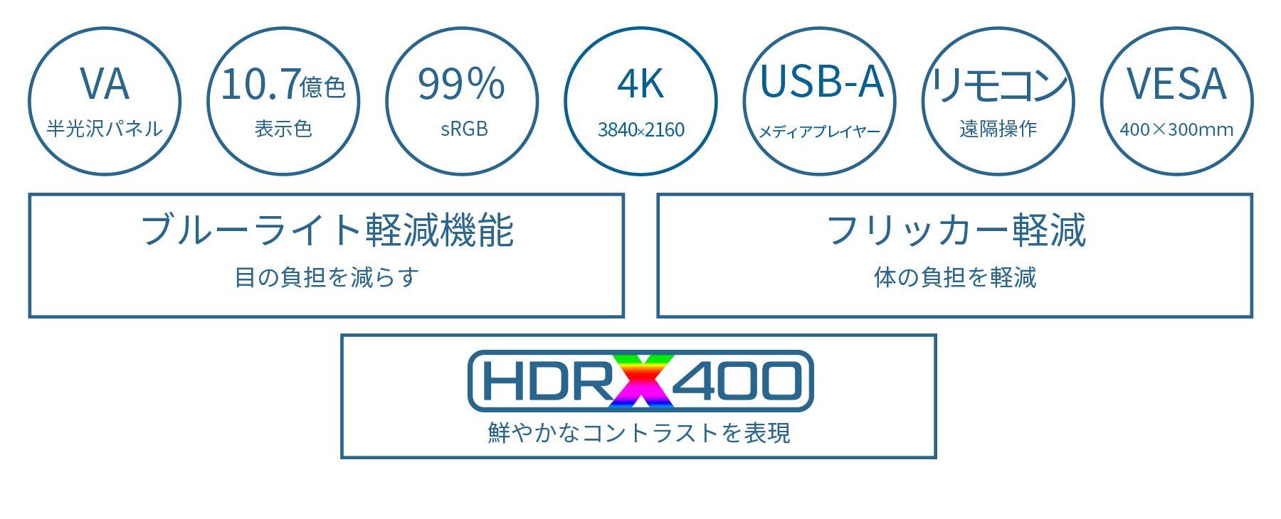 長時間使用時に眼に優しいフリッカー(ちらつき)軽減モードおよび、ブルーライト軽減モードを搭載します。