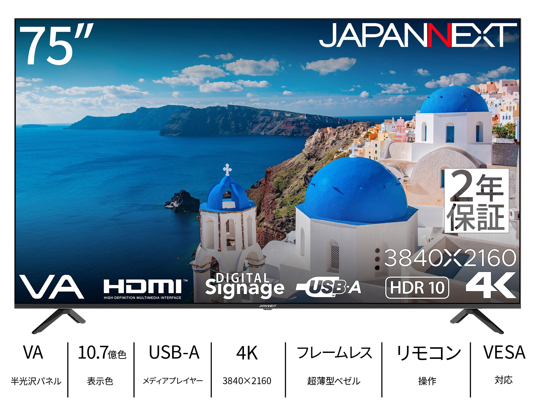 75インチの大画面でVAパネルを搭載し、4K(3840x2160)解像度に対応した大型液晶モニターとなります。4KはフルHD(1920×1080)解像度の約4倍の作業領域を実現する3840×2160ドットの解像度となり、高精細な表示を実現できます。大画面液晶は大きな会議室での使用はもちろん、サイネージ用途や、映画などの鑑賞等様々な用途にお使いいただけます。