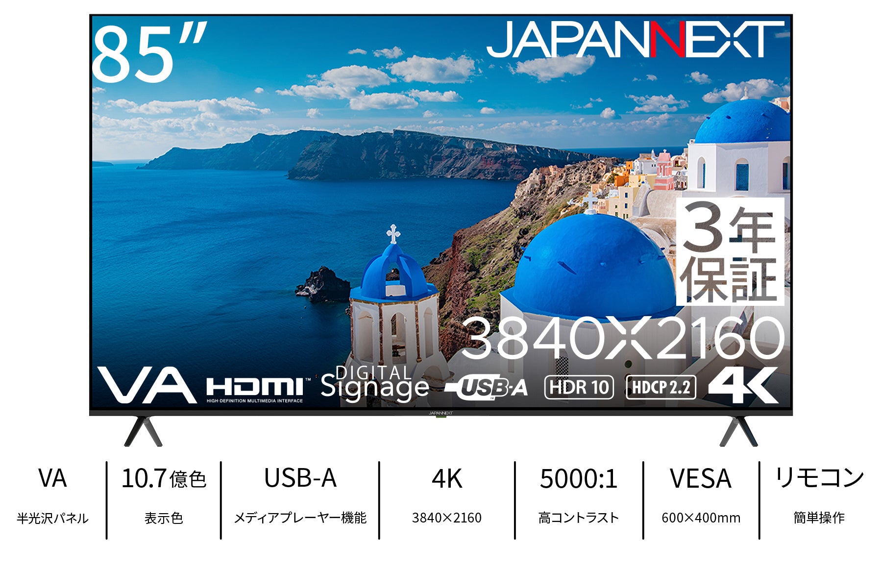 大画面85インチのVAパネルを搭載した4K(3840x2160)解像度の大型液晶モニターです。4KはフルHD(1920×1080)解像度の約4倍の作業領域を実現する3840×2160ドットの解像度となり、高精細な表示を実現できます。大画面液晶は大きな会議室での使用はもちろん、サイネージ用途や、映画などの鑑賞等様々な用途にお使いいただけます。