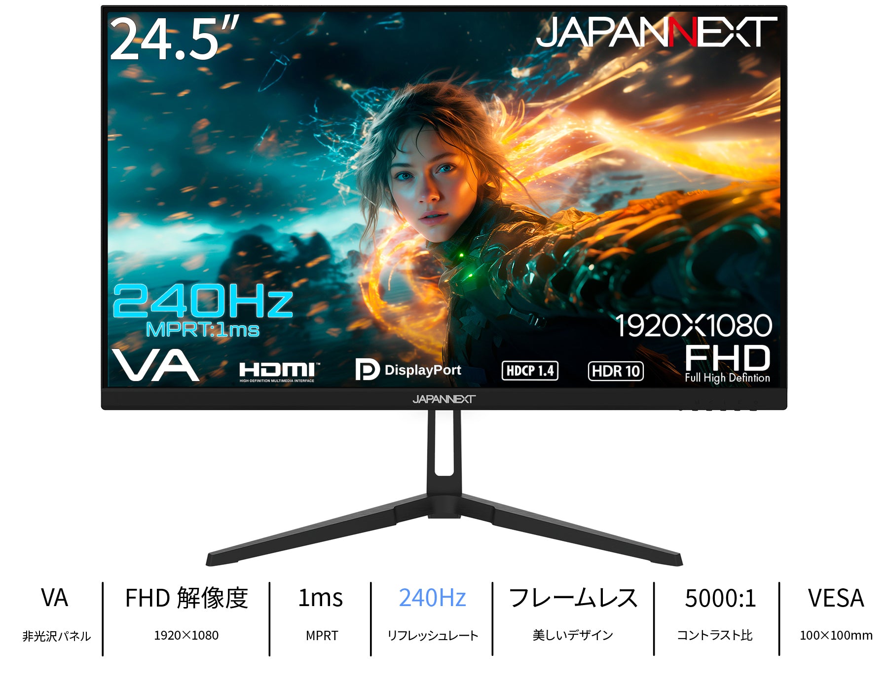 24.5インチのVAパネルを搭載、240Hzの高速リフレッシュレートに対応したフルHD(1920 x 1080)解像度のゲーミングモニターです。240Hzの高速リフレッシュレート、1ms(MPRT)の高速液晶応答速度に対応。高精細で滑らかな表現を可能にし、FPSなどの動きの速いゲームで快適なゲームプレイを実現します。※MPRT 1msはリフレッシュレート100Hz以上で有効。
