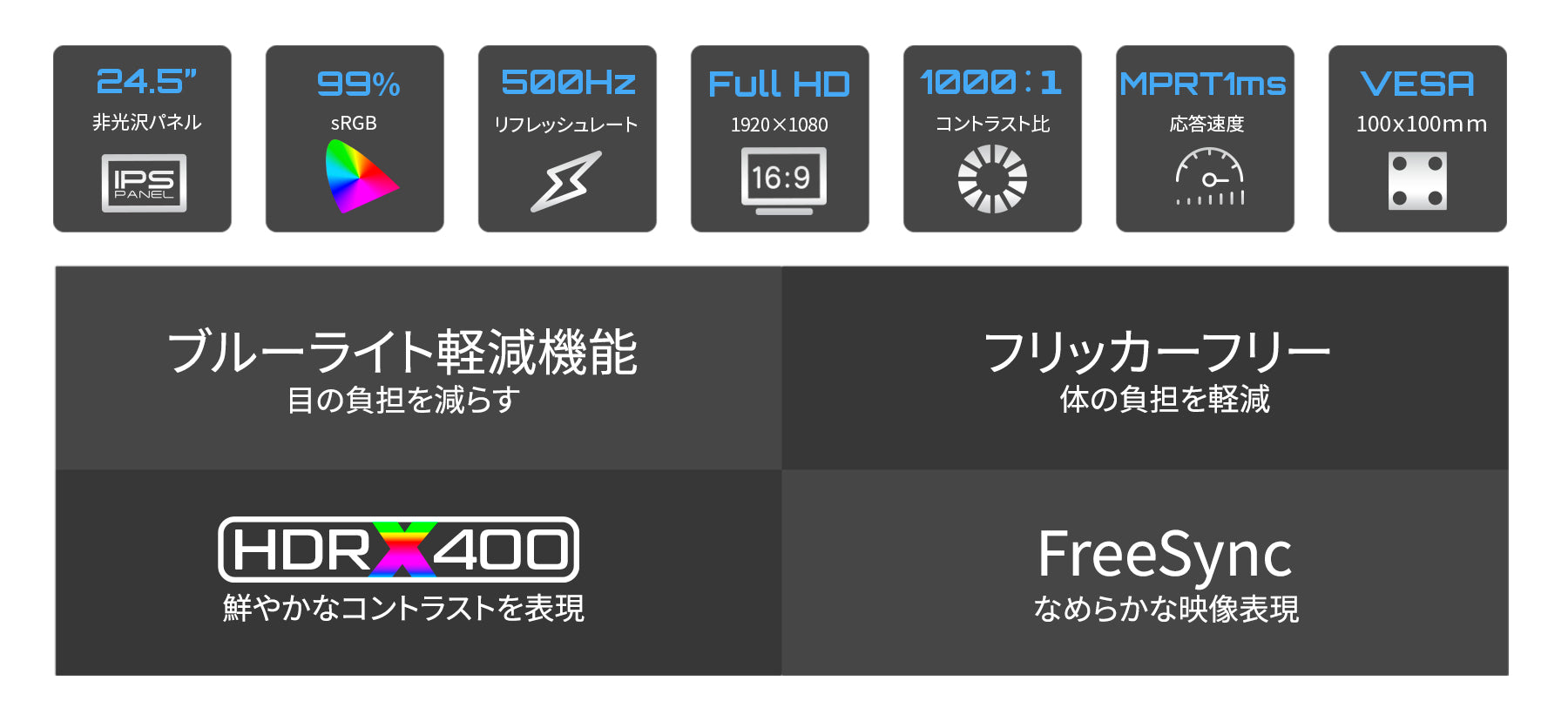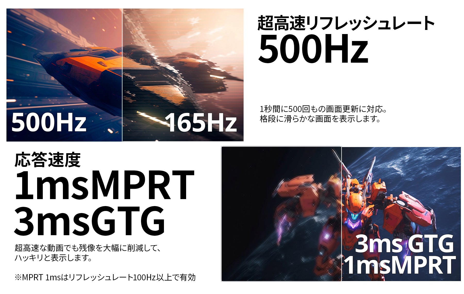 リフレッシュレート500Hz / 応答速度MPRT1ms GTG3ms