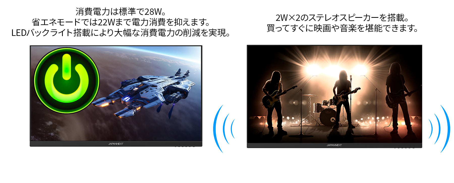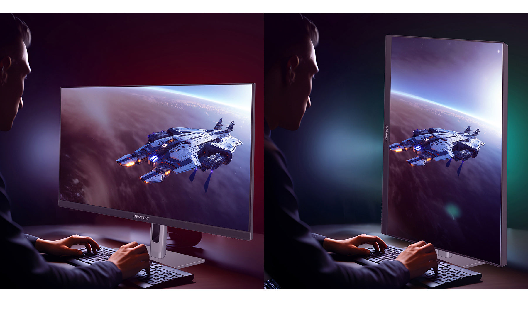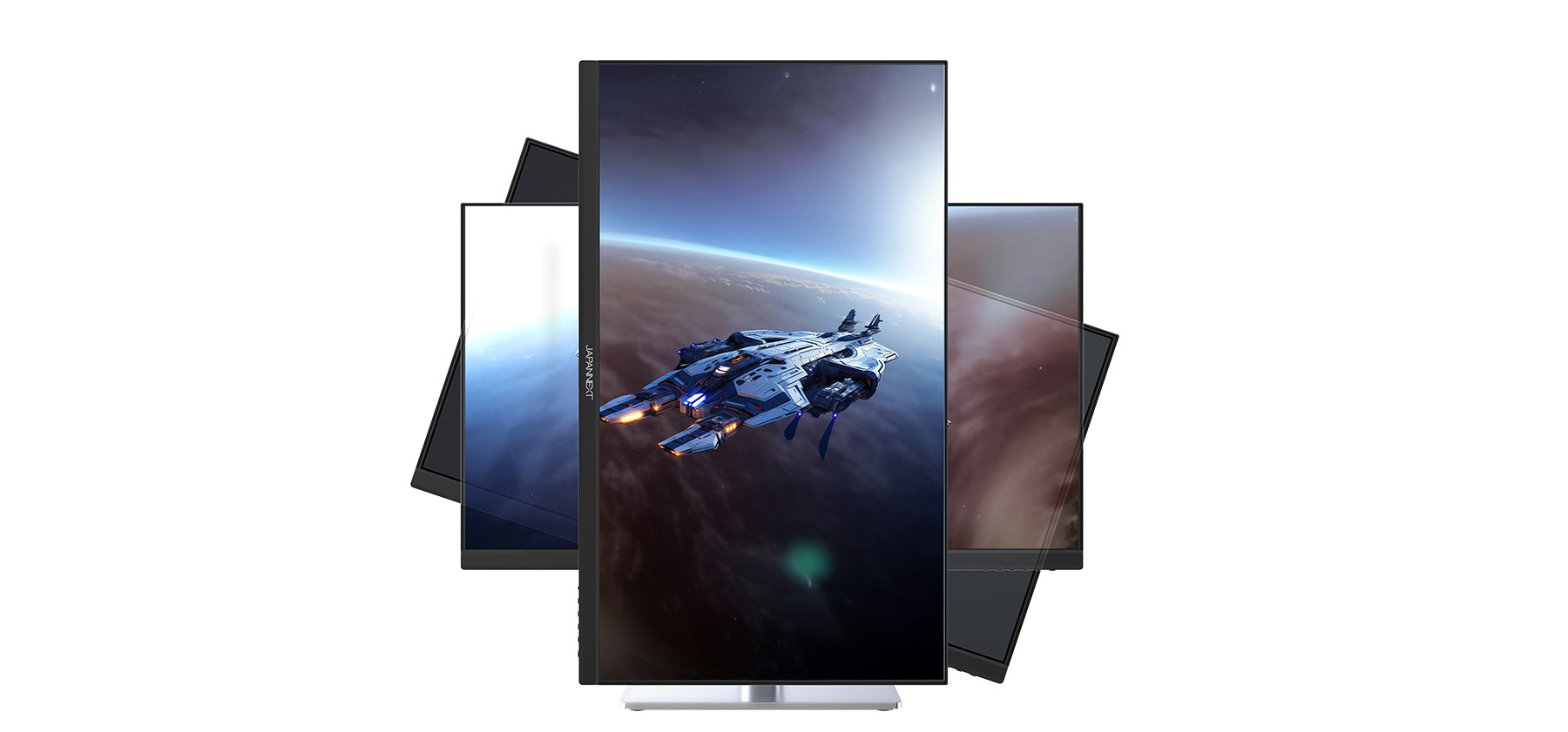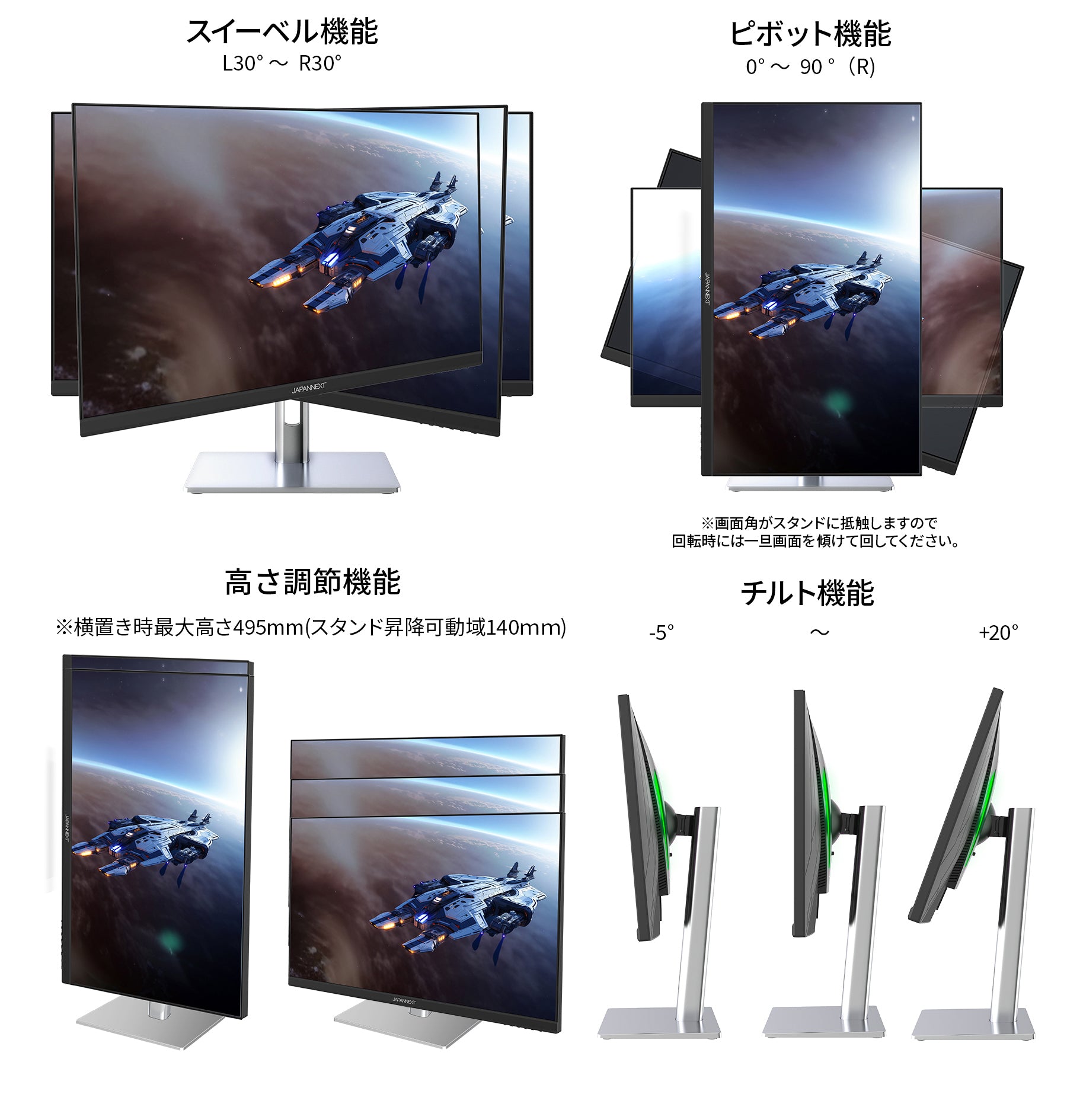 最大140mm(横置時)の範囲で高さを調整出来る昇降式スタンドを採用、お好みの高さにモニターを固定できます。さらにピボット(回転)機能にも対応、縦でも使用することが出来ます。100x100mmのVESAマウントに対応、モニターアームやモニタースタンドなどへの取り付けが可能です。2Wx2のスピーカーを内蔵します。
