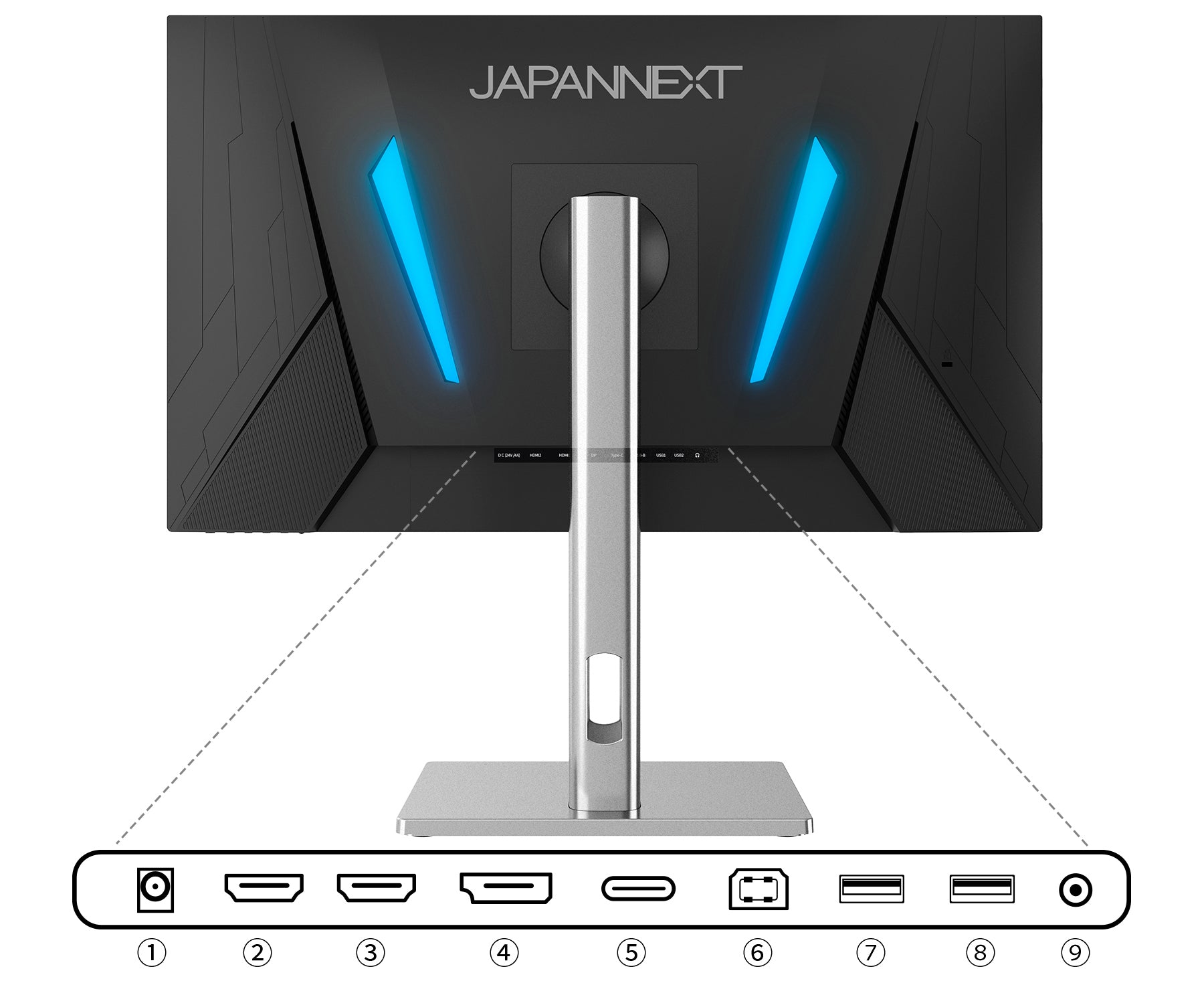 映像入力端子は、HDMI2.1 x2(255Hz対応), DisplayPort1.4 x1(500Hz対応), USB Type-C x1(500Hz対応, 最大65W給電)を搭載し、PCやコンソールゲーム機など様々な機器と接続が可能です。※HDMI接続時は255Hzがリフレッシュレートの上限となります。USB-C(最大65W給電)は、対応のPCであればUSB-Cケーブル1本でモニターへの映像出力とノートPCへの給電が可能。ケーブル1本でスッキリ接続出来るだけでなく、テレワーク、出社併用の場合などノートPCのACアダプターを持ち運ぶ必要が無くなります。